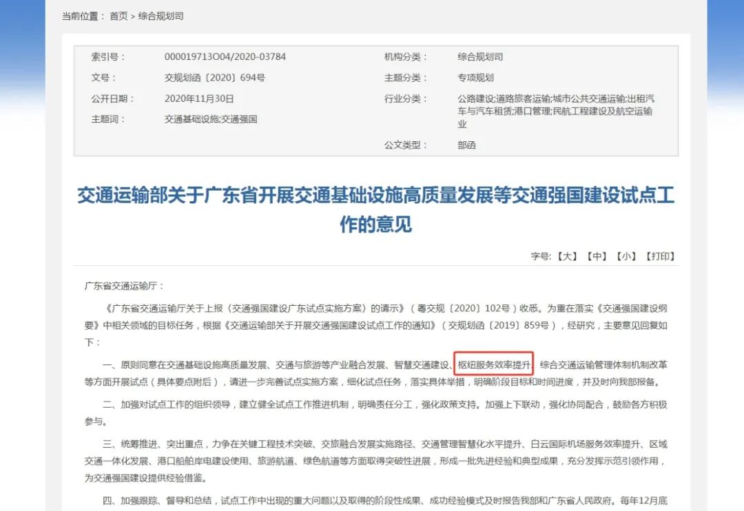 2020年10月10日,交通運輸部將“樞紐服務效率提升”列為廣東省承擔的全國交通強國建設試點任務之一,包括提升口岸通關便利化水平、提升白云機場國際航空樞紐輻射能力、提升港口智慧綠色發(fā)展水平三塊板塊。