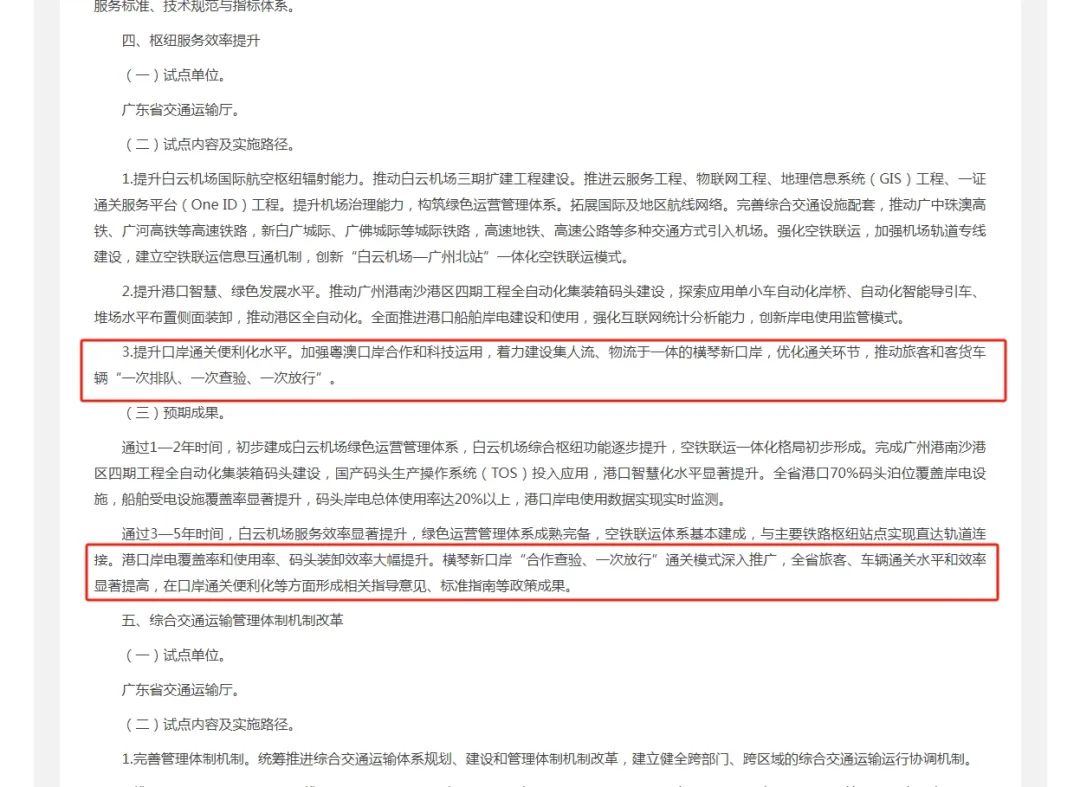 預期通過3—5年時間,實現(xiàn)白云機場服務效率顯著提升,綠色運營管理體系成熟完備,空鐵聯(lián)運體系基本建成,與主要鐵路樞紐站點實現(xiàn)直達軌道連接;港口岸電覆蓋率和使用率、碼頭裝卸效率大幅提升;橫琴口岸“合作查驗、一次放行”通關模式深入推廣,全省旅客、車輛通關水平和效率顯著提高,在口岸通關便利化等方面形成相關指導意見、標準指南等政策成果。
