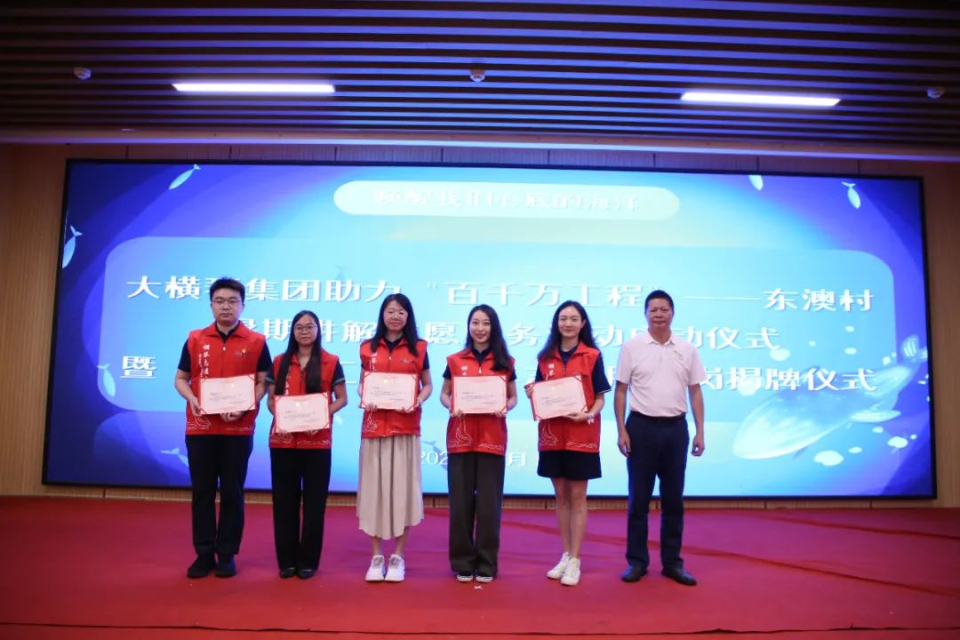 儀式上,共青團珠海市委員會權(quán)益與社會工作部部長王臻,珠海市萬山鎮(zhèn)人民政府黨委副書記、鎮(zhèn)長黃軒流,珠海大橫琴集團有限公司黨委副書記戴碩濤,珠海市萬山鎮(zhèn)東澳村書記石志明,萬山海洋生物科普館館長安東共同為“百千萬工程”青年志愿服務(wù)崗揭牌,啟動助力“百千萬工程”——東澳村暑期講解志愿服務(wù)活動。