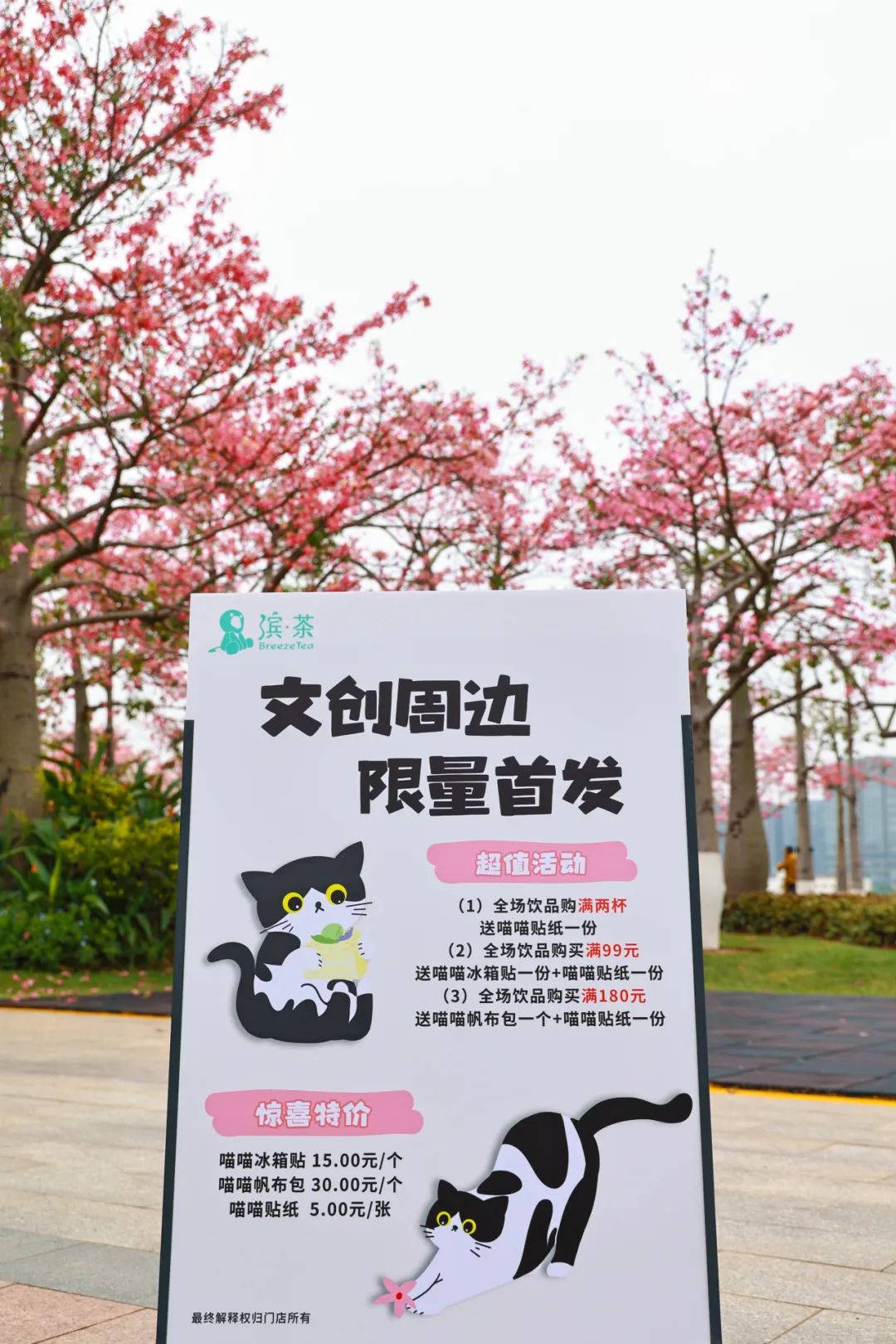 驛站自主品牌“濱·茶”更是與澳門高校學生設計工作室合作,聯手打造“貓店長”花期限定主題文創,用萌寵為花海注入更多靈氣,讓游客在被大自然治愈之余,也享受到小動物帶來的舒心。